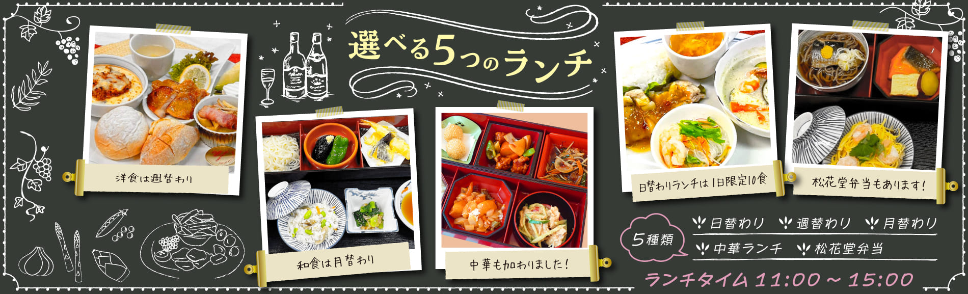 ランチではご家族やご友人、お一人でも日常的にご利用いただけます。季節を楽しむ【月替りランチ】や自家製の手ごねパンが好評な【週替りランチ】など4種類のセットメニューからお楽しみいただけます。ランチは事前予約無くご利用できますのでお気軽にお越しください。